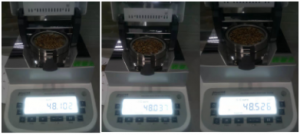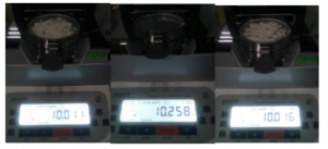 2.將防風(fēng)盤、支架、樣品盤一一裝好,接通電源,按下開機(jī)鍵,顯示屏進(jìn)入開機(jī)界面,首先按去皮鍵減去樣品盤重量,后將100g砝碼放入托盤進(jìn)行校準(zhǔn);