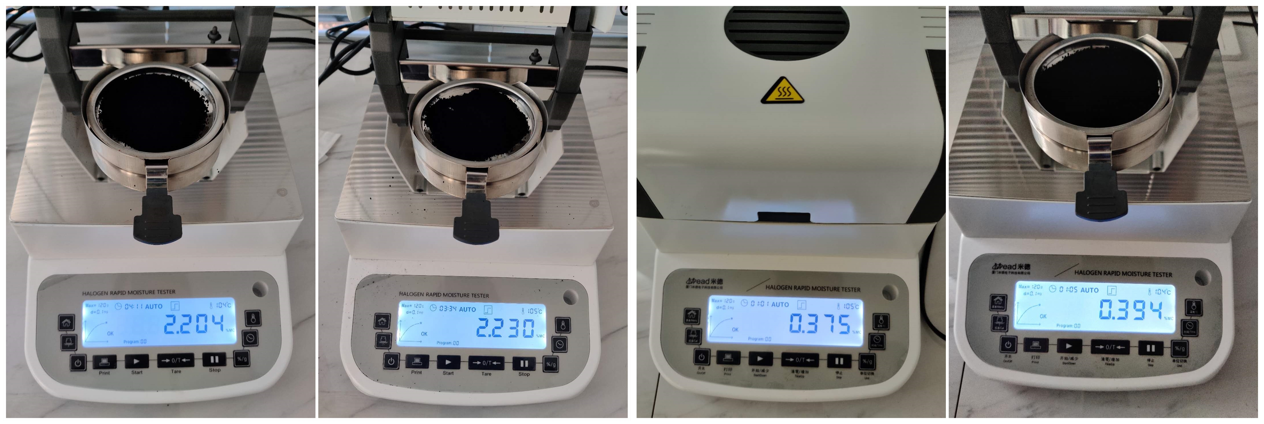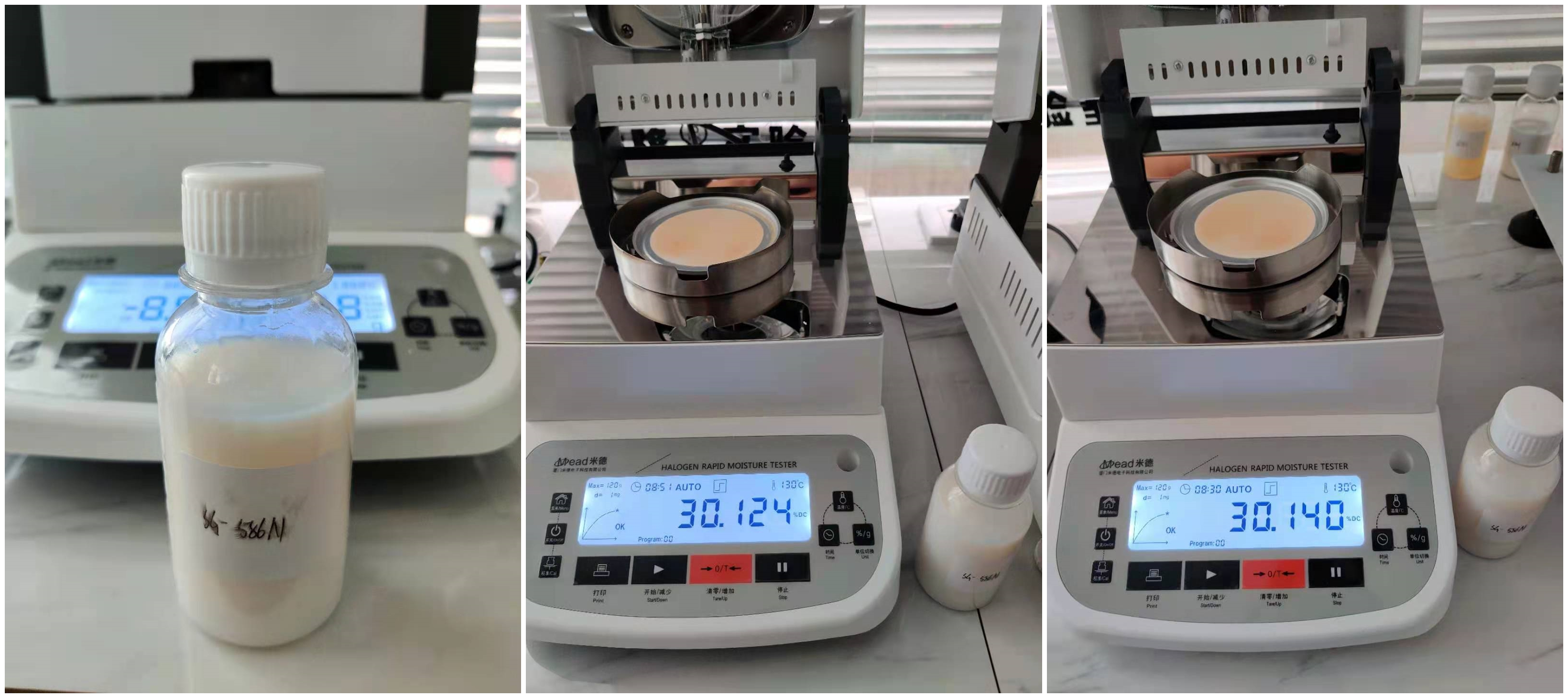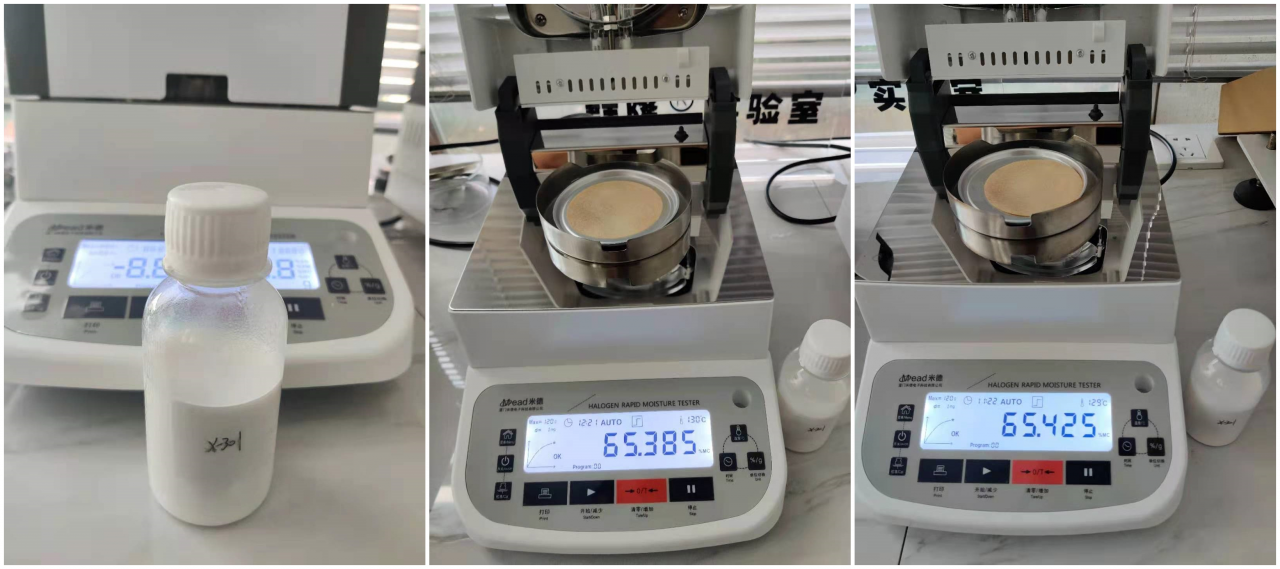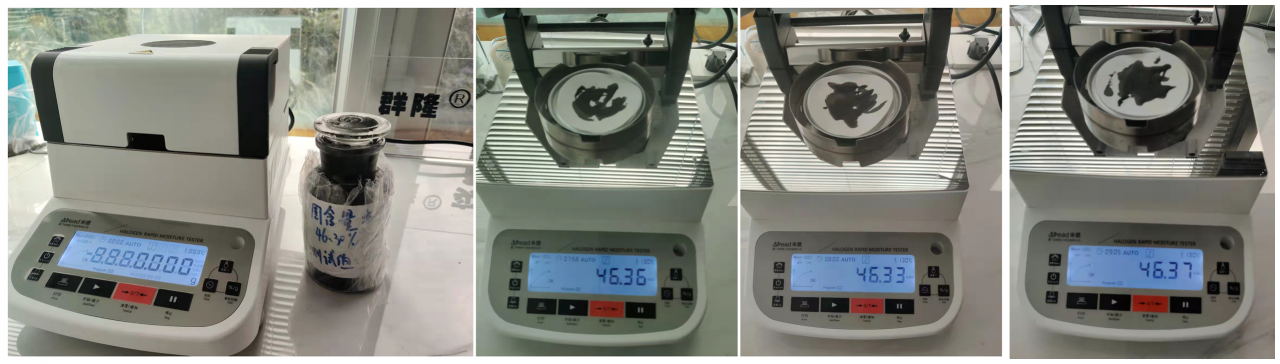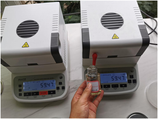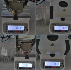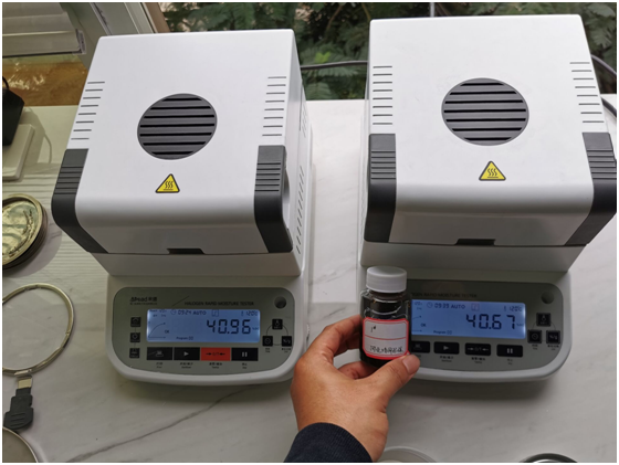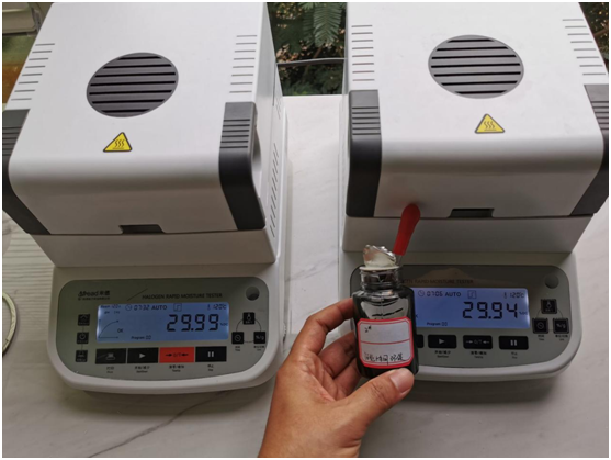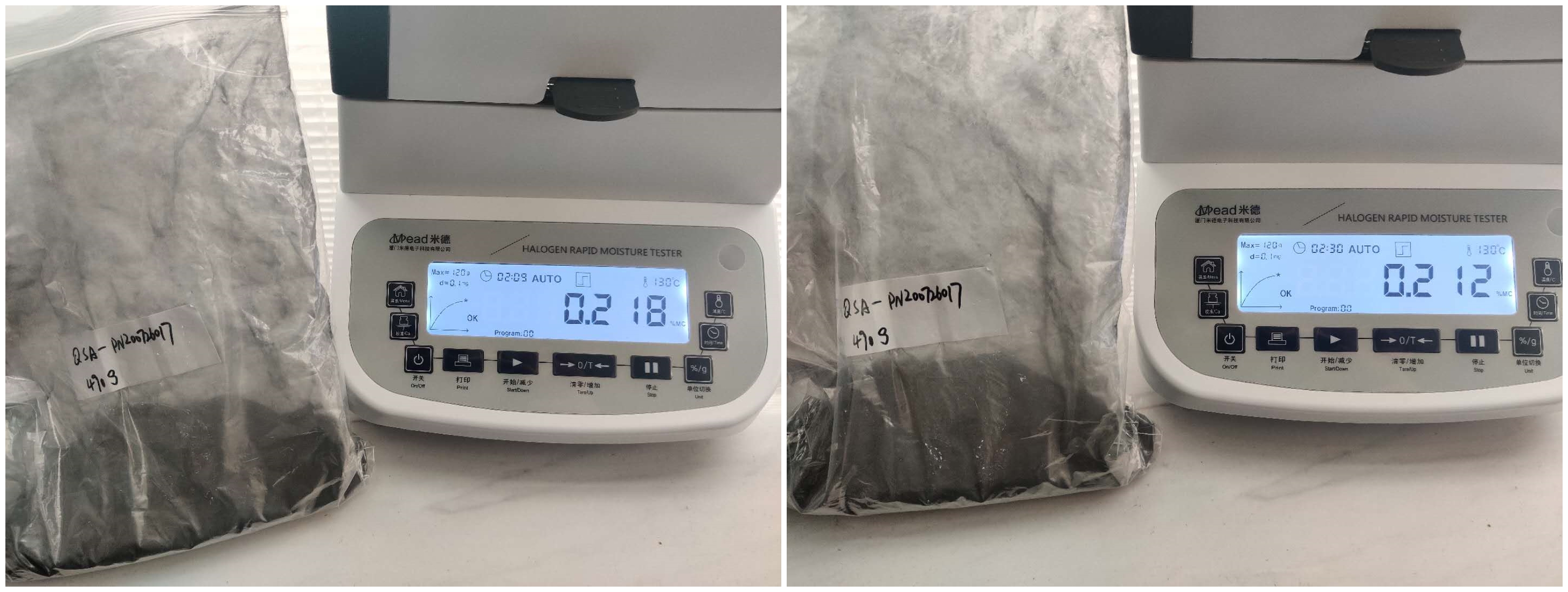 4.10、將裝有樣品的樣品瓶放入加熱孔中,插入空芯針,在水分測(cè)定儀上輸入樣品重量,調(diào)整延時(shí)時(shí)間,同時(shí)水分儀上開(kāi)始測(cè)量。在屏幕上點(diǎn)方法,并且在方法中輸入樣品稱重質(zhì)量,等待測(cè)量完成顯示最終含水量結(jié)果。