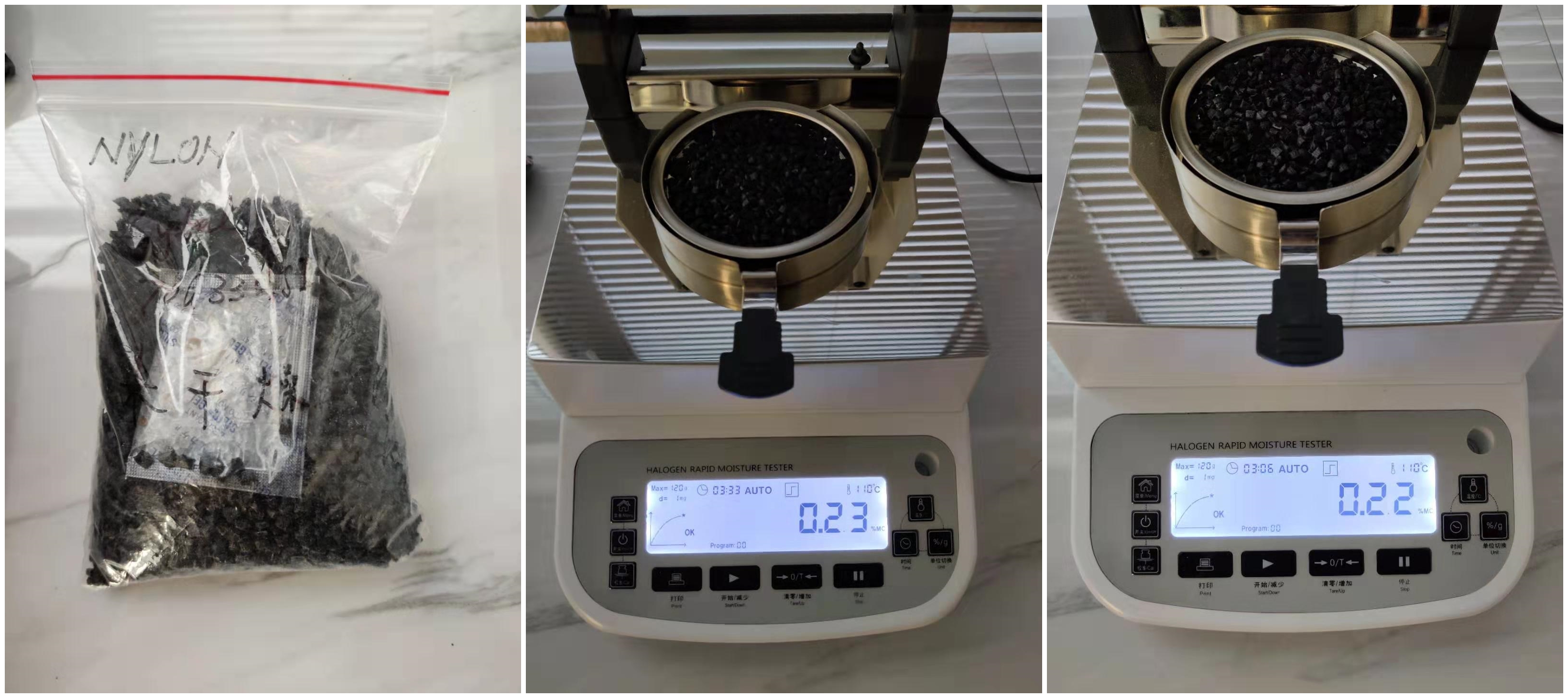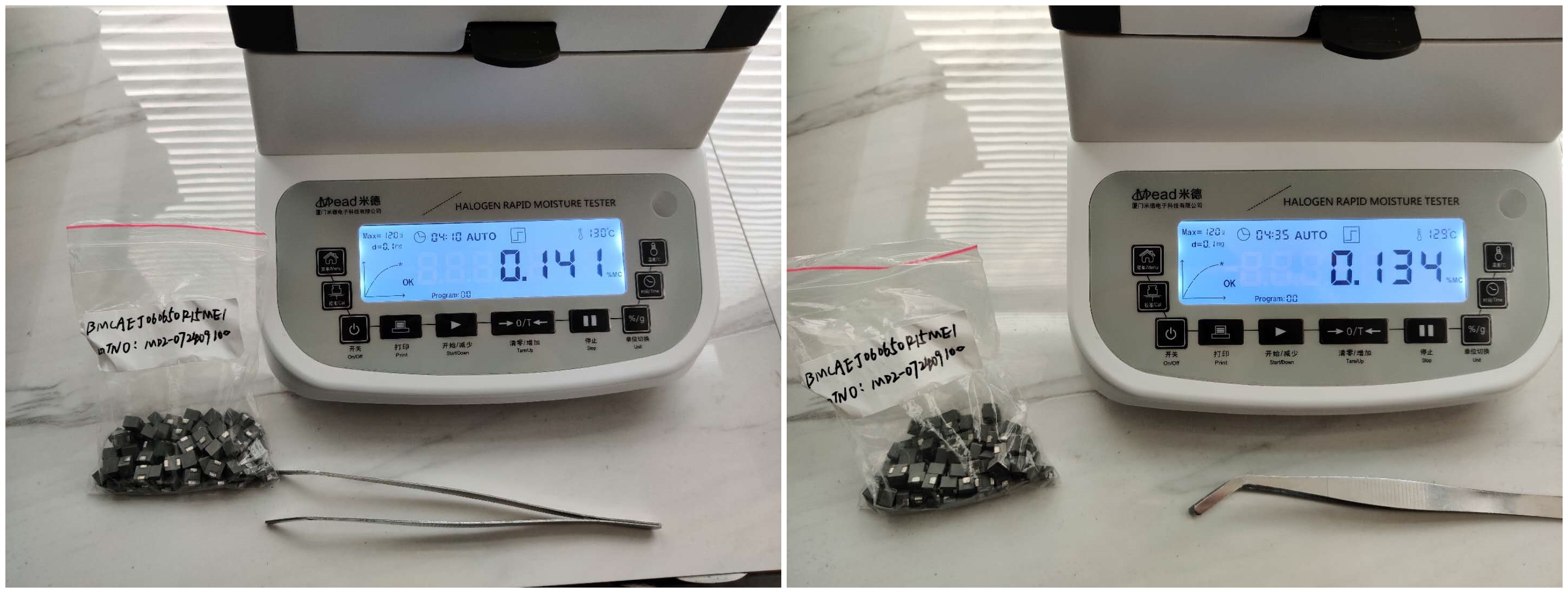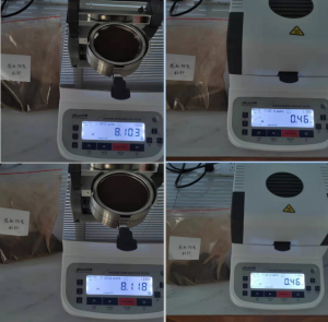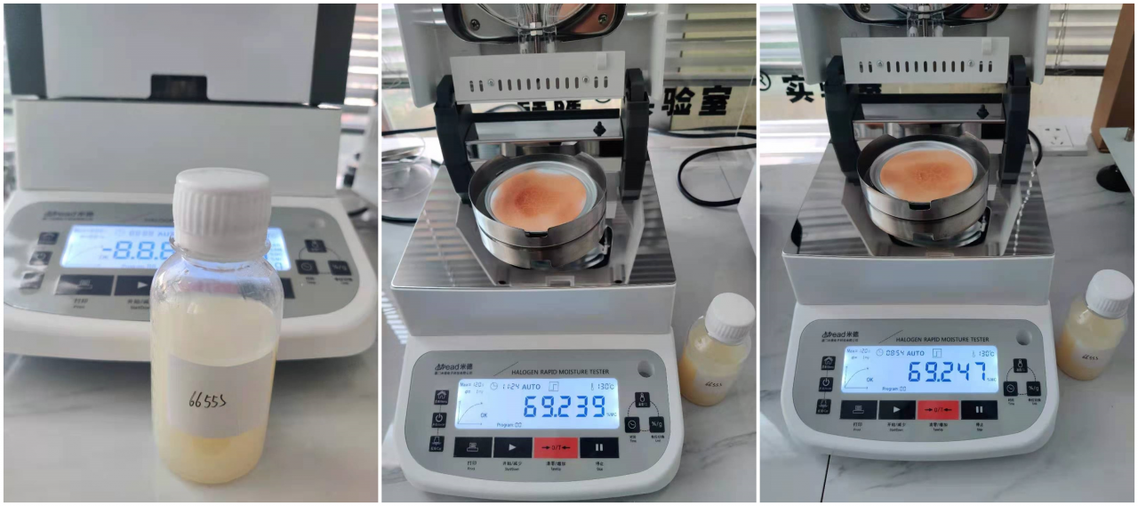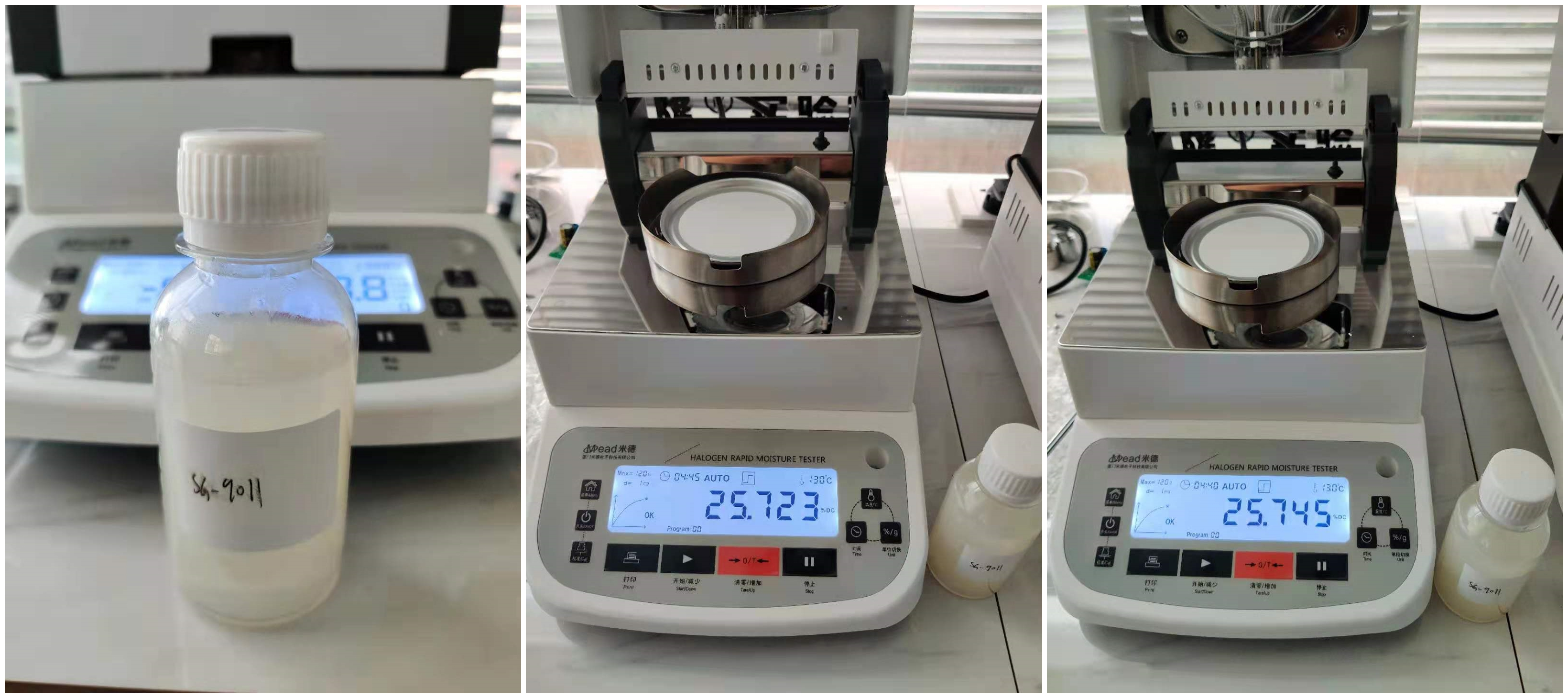 4.10、將裝有樣品的樣品瓶放入加熱孔中,插入空芯針,在水分測(cè)定儀上輸入樣品重量,調(diào)整延時(shí)時(shí)間,同時(shí)水分儀上開(kāi)始測(cè)量。在屏幕上點(diǎn)方法,并且在方法中輸入樣品稱重質(zhì)量,等待測(cè)量完成顯示最終含水量結(jié)果。