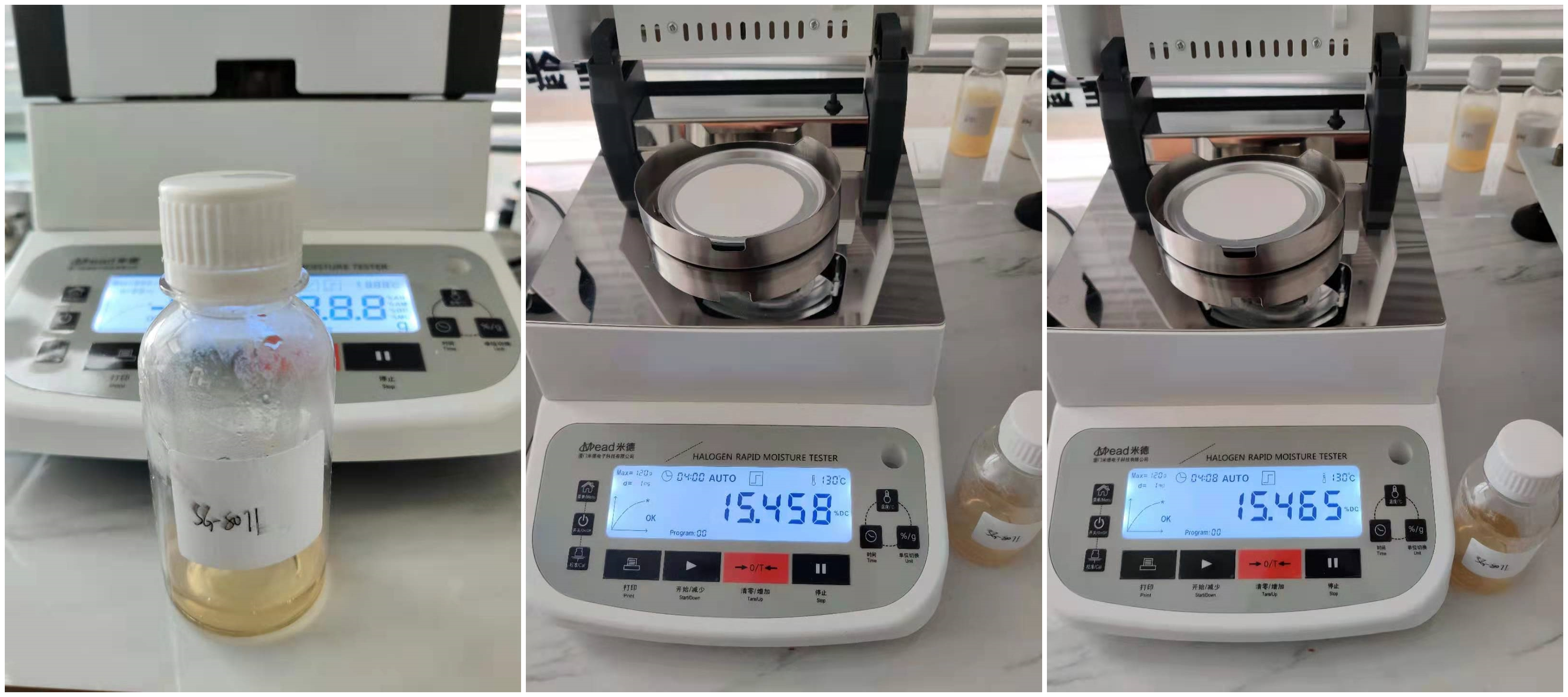 3.7、如果新加入的卡爾費(fèi)休試劑顏色顯示為淡黃色,表示試劑已經(jīng)吸潮,儀器界面中間不會(huì)顯示過(guò)碘,而是顯示“正在穩(wěn)定過(guò)正中,請(qǐng)等待”,此時(shí)不需要加水,等待儀器電解至平衡,顯示正常狀態(tài)即可。