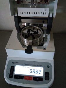 為了得到更精確穩(wěn)定的數(shù)據(jù)結(jié)梅,在進(jìn)行第二次測(cè)試過程前先等待話梅干水分儀降溫,待儀器本身溫度降至40度以下時(shí),同樣取3克話梅干碎于不銹鋼托盤中,將話梅干碎平鋪均勻,這次我們把溫度設(shè)定在160℃,按“START”鍵開始測(cè)試,30分08秒后檢測(cè)結(jié)束,檢測(cè)數(shù)據(jù)顯示58.82%;