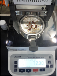 用鑷子提取2.2克牛肉肉末,置于不銹鋼托盤(pán)中,用鑷子將牛肉肉末平鋪均勻,溫度設(shè)置145℃用儀器進(jìn)行加熱,檢測(cè)結(jié)束,檢測(cè)數(shù)據(jù)顯示71.16%;為了檢測(cè)儀器的精確性,待儀器溫度降至50℃以下時(shí)進(jìn)行第二次測(cè)量,用實(shí)驗(yàn)勺提取2.2克牛肉,置于不銹鋼托盤(pán)中,用實(shí)驗(yàn)勺將面粉平鋪均勻,溫度設(shè)置150℃用儀器進(jìn)行加熱,檢測(cè)結(jié)束,檢測(cè)數(shù)據(jù)顯示71.85%;